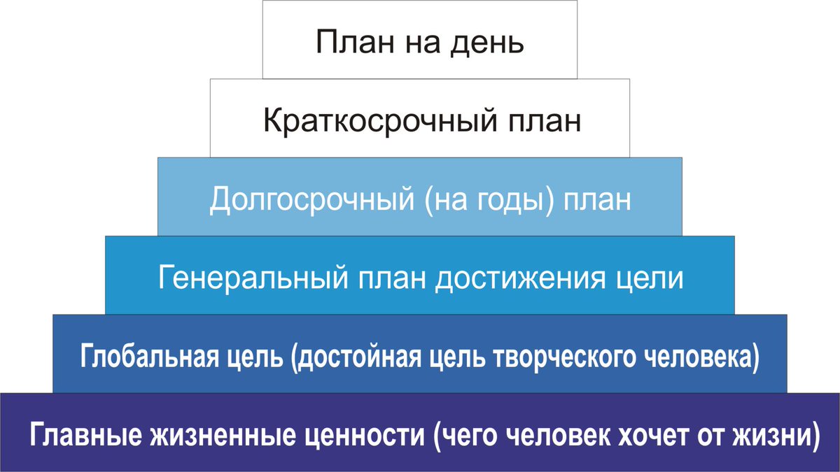 Это некое устойчивое триединство и, если ты попытаешься исключить что-то одно, то твоя жизнь не будет полноценной. Реализуя эти 3 цели, ты сможешь достичь счастья, успеха и богатства. Таким образом, твоя жизнь станет гармоничной. Если нет вот этих основных целей в жизни, то смысл ставить какие-то другие вообще бессмысленно. У тебя должна быть четкая иерархия целей. От самой главной к более мелким. Когда ты эту структуру осознал и принял, то в каждой из 3 целей, ты уже будешь выделять множество подцелей во всех сферах жизни.