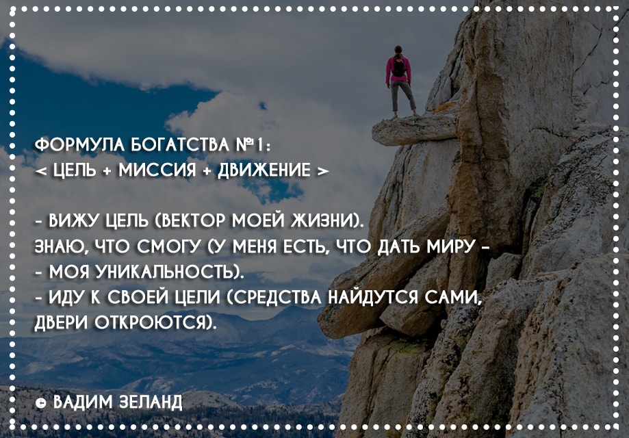 Определение человеком жизненных целей является одним из главных условий достижения счастья, успеха и богатства. Причем важно не только ставить цели, но и часто думать о том, что ты способен их достигнуть и что ты достигнешь их обязательно. Ни в коем случае не стоит думать о препятствиях на пути к своей жизненной цели и воображать зловещий мрак.