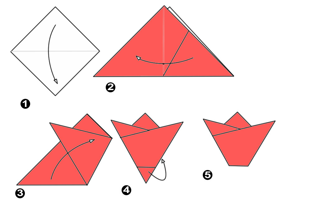 Один из вариантов создания чудесной цветочной композиции своими руками — техника работы с бумагой — оригами. С помощью этой техники можно сложить из обычного листа бумаги практически любой цветок, составить красивый букет или применить его как элемент декора. Простые схемы цветов оригами станут настоящим подспорьем в работе, особенно если вы никогда раньше с этим не сталкивались.Они помогут создать ваш алый цветочек даже маленькому ребенку. Сегодня предлагаем вам сделать очень простой цветок в технике оригами, а также познакомиться с другими несложными схемами их изготовления из бумаги. Первую схему разработал очень известный мастер оригами Йост Лангевельд, поделки которого отличаются простотой, оригинальностью и красотой. Они очень интересные и их совсем не сложно собрать. Для создания цветка оригами нам понадобится всего два листа бумаги квадратной формы, традиционной для работы в технике оригами.На всю работу вам понадобится всего пять минут свободного времени. Цвет бумаги вы выбираете самостоятельно.