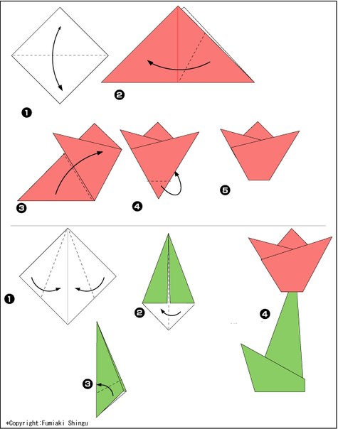 Все зависит от того, какой цвет вы предпочитаете. Что касается стебля — бумагу лучше всего выбирать в зеленых тонах, тогда цветок будет смотреться реалистичнее. Также можно использовать цветную бумагу. В этом случае изделие будет еще оригинальнее. Не менее интересные модели цветов оригами — это как розы, лилии, лотосы и так далее. Ниже вы найдете простые цветовые схемы, с которыми вы легко справитесь без посторонней помощи.С такими поделками будет интересно работать и малышам. Они с радостью соберут из бумаги целый красивый букет, который можно подарить маме, бабушке, сестре в подарок на день рождения или любой другой праздник. Как нам удалось с вами убедиться, создание красивых цветов оригами по несложным схемам — очень легкое и увлекательное занятие. Вам или ребенку потребуется минимум времени и максимум заботы. Освоив простые схемы добавления цветов в оригами, вы легко перейдете к более сложным схемам, например, модульному оригами.Здесь цветы состоят из большого количества деталей — модулей, изготовление и сборка которых требует большего мастерства, усидчивости и внимательности.