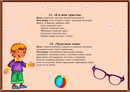 2. выходит ребенок, перед ним разложены 5-6 предметов. Он внимательно рассматривает их. Затем отворачивается и дает описание предметов (описание возможно по схеме: цвет, форма, материал)