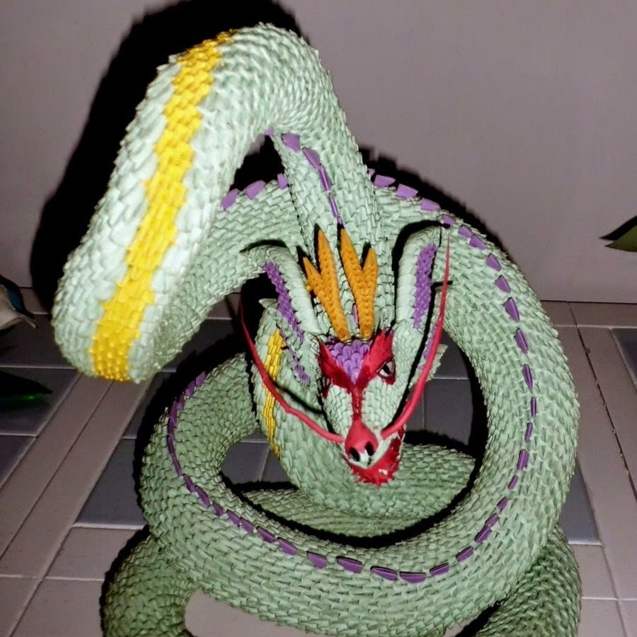 Трехглавый зеленый змей собирается, используя технику сборки лебедя. В китайской технике сборки модель собирается из длинной змейки.