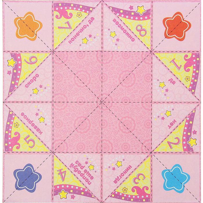 Бумажный предсказатель может ответить на любой вопрос, важно заранее продумать тематику и оформление. Как правило, получается 8 отдельных отсеков, на которых можно написать ответы в виде слов, фраз или цифр. Рассмотрим самые распространенные гадалки для девочек вместе с фото и предсказаниями: