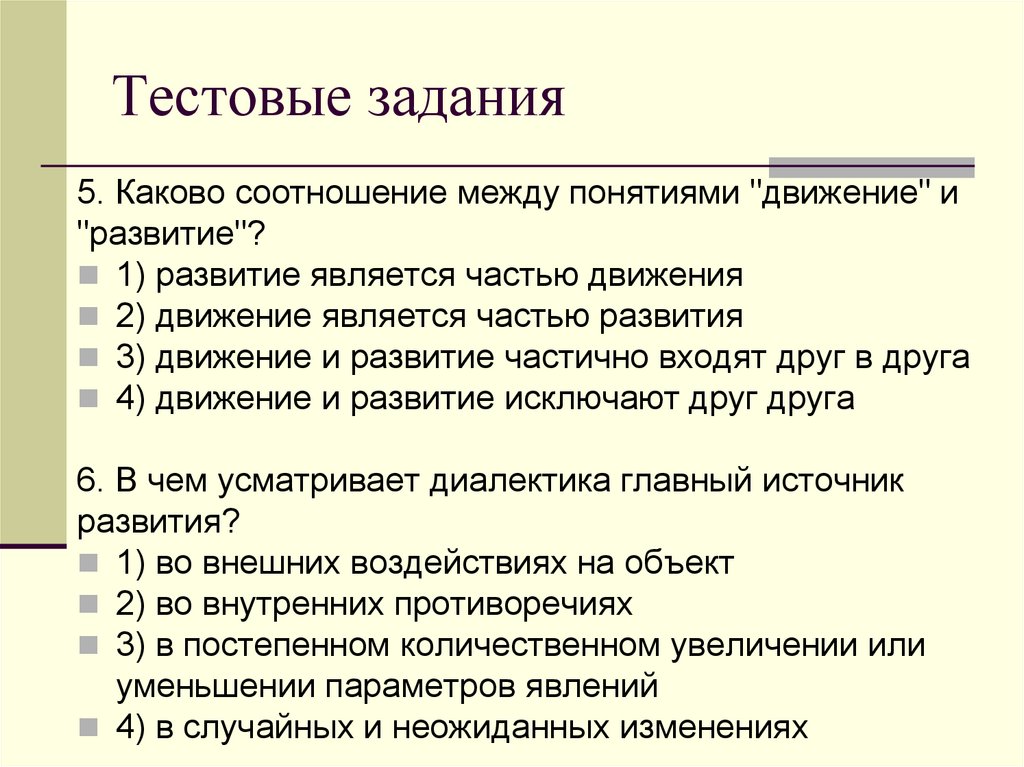 Диалектика рассматривает мир в постоянном изменении и развитии, в движении. В этом нас убеждают и повседневный опыт, и достижения науки, и общественная практика. Так, многочисленные тела Вселенной — результат длительного развития различных видов материи. В процессе эволюции материального мира возник человек.
