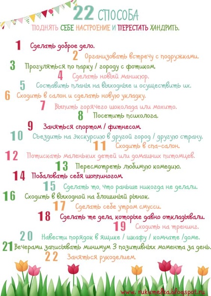 Итак, вы выбрали одно дело прямо сейчас? Надеюсь, что так 🙂 Если вы придумываете всевозможные оправдания, чтобы прямо сейчас не делать что-то для улучшения вашего настроения — игнорируйте это! Мы оба знаем, что нужно действовать, чтобы все стало лучше, поэтому сделайте что-нибудь сейчас.