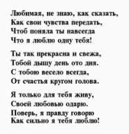 Я любуюсь тобой при каждой встрече! Ты настолько мне дорога, что жизнь меркнет во всех её проявлениях, если тебя нет рядом! Ты – именно тот человек, с кем мне интересно, с кем я бы хотел проводить каждую свою свободную минуту! Мне очень хочется сделать тебя такой счастливой, чтобы милая улыбка не сходила с твоего нежного лица. Я благодарен судьбе за встречу с тобой! Моя любовь, спасибо тебе, за то, что ты рядом, что понимаешь меня. У нас с тобой так много общего. Я всегда буду благодарен тебе за то счастье, которое ты мне даришь каждый день только одним своим присутствием. Это счастье для меня уже в том, что ты есть и рядом со мной!»