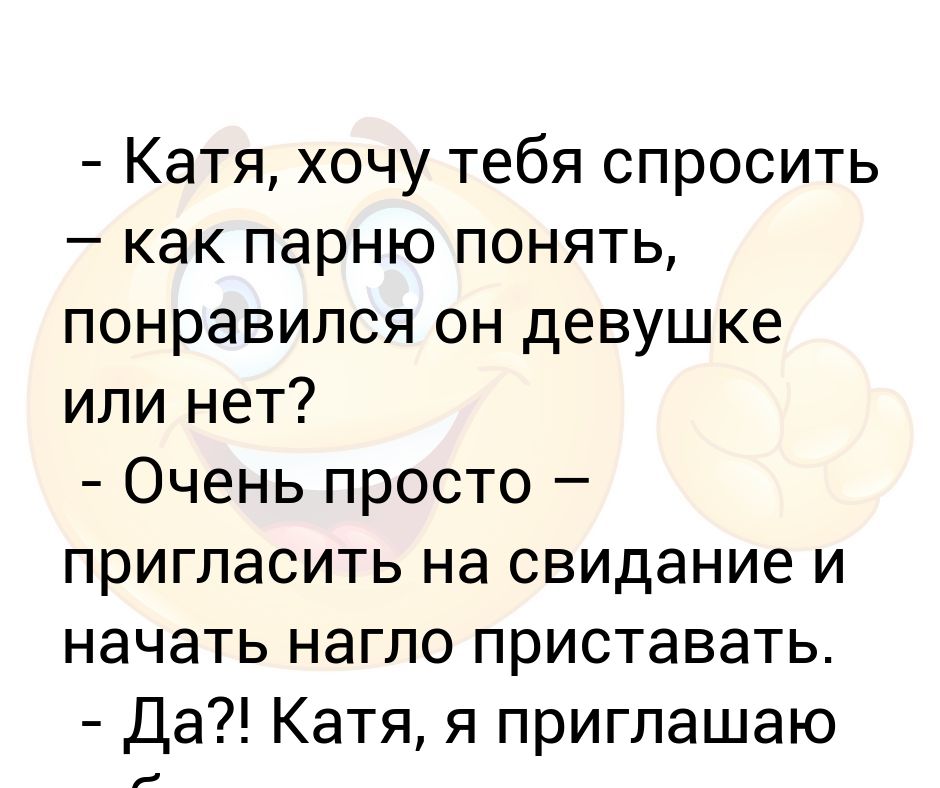 Во время личного диалога отметь, насколько внимательно она слушает тебя. Если во время рассказа о неинтересной ей вещи барышня все равно задает уточняющие вопросы и старается вникнуть в тему, она наверняка симпатизирует тебе. Проверь ее – расскажи не очень смешной анекдот. Девушка, которой ты нравишься, не станет обижать тебя фразами «не смешно» или «баян». Она искренне рассмеется, как будто сидит на комедийном шоу.