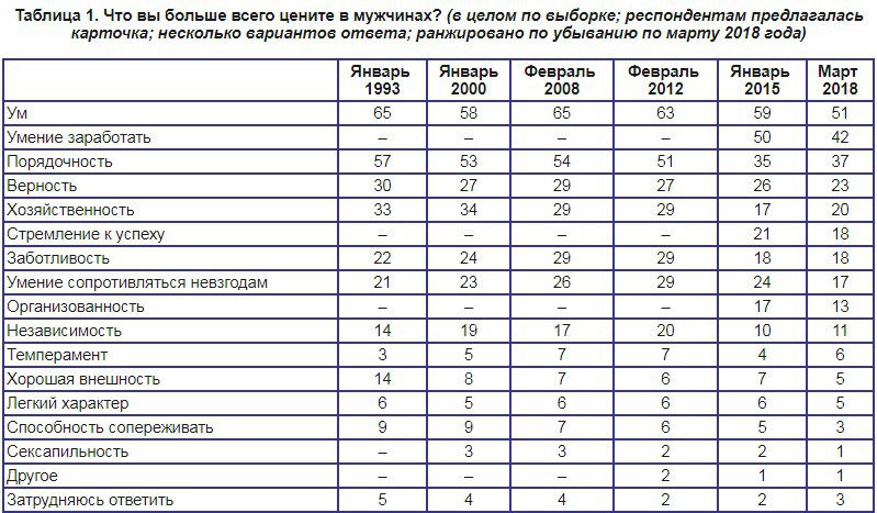 Так, в 2008 году исследовательский портал Superjob.ru провел опрос среди 1000 женщин. По результатам, представительницы прекрасного пола больше всего ценят ум и честность. Причем для мужчины в целом, как представителя мужского пола, девушки выделяют важными такие качества, как щедрость и чувство юмора, а для законного супруга &mdash верность и умение зарабатывать.