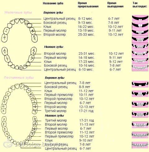 Прорезывание молочных зубов у детей в среднем начинается в возрасте 6-7-месяцев, когда заканчивается формирование коронки зуба и начинает развиваться его корень. Первыми в полости рта появляются нижние центральные резцы, затем (в 8-9 мес.) – верхние центральные резцы. Прорезывание верхних боковых резцов происходит у ребенка в 9-11 мес.; нижних боковых – в 11-13 мес. Далее примерно в 1-1,5 года появляются первые верхние моляры (коренные зубы), следом за ним — первые нижние моляры. Затем последовательно прорезываются клыки на верхней и нижней челюсти (в 16-20 и 17-22 мес. соответственно). Прорезывание молочных зубов завершается в возрасте 2-2,5 лет появлением вторых нижних и верхних моляров.