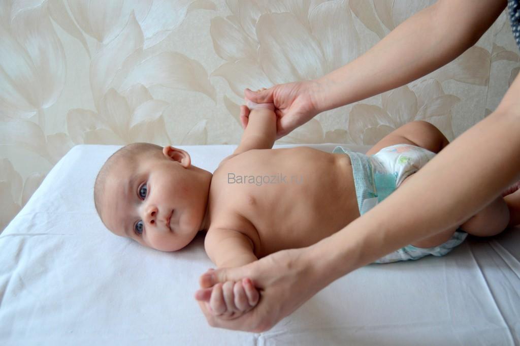 Делается, когда ребенок находится на спине. Правой рукой мама обхватывает правую голень малыша, при этом левой рукой легко фиксирует левую ногу, чтобы та не сгибалась. Затем мама начинает мягко тянуть правую ножку вниз, а затем в сторону переворота, чтобы правая нога оказалась над левой. Не надо спешить и тянуть сверх меры, ребенок должен побыть в состоянии поворота около 10 секунд.
