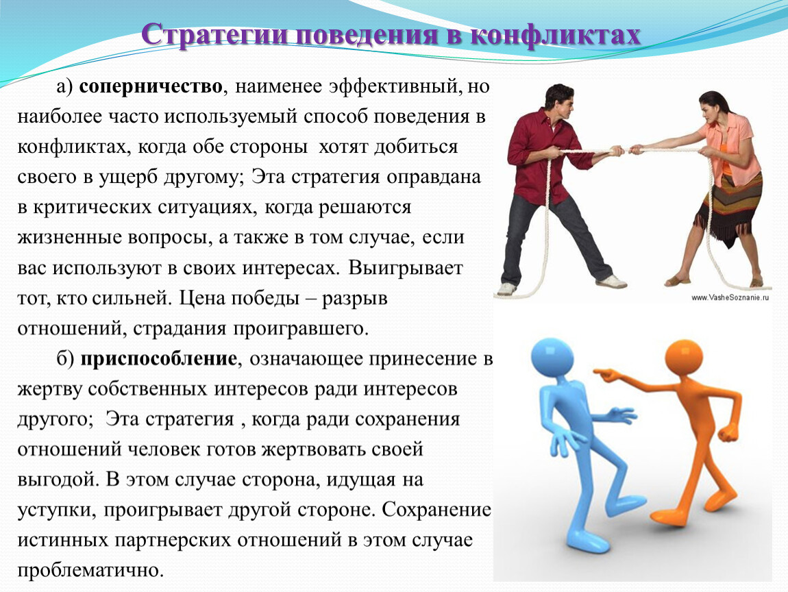 Стремление добиться своего за счет другого, «силовой» способ разрешения конфликта. Эта стратегия оправдана в критических ситуациях, когда решаются жизненные вопросы. Выигрывает тот кто сильнее. Цена победы – разрыв отношений, страдания проигравшего. Чаще всего эту стратегию используют люди, уверенные в себе, агрессивные, амбициозные. (СЛАЙД 26)