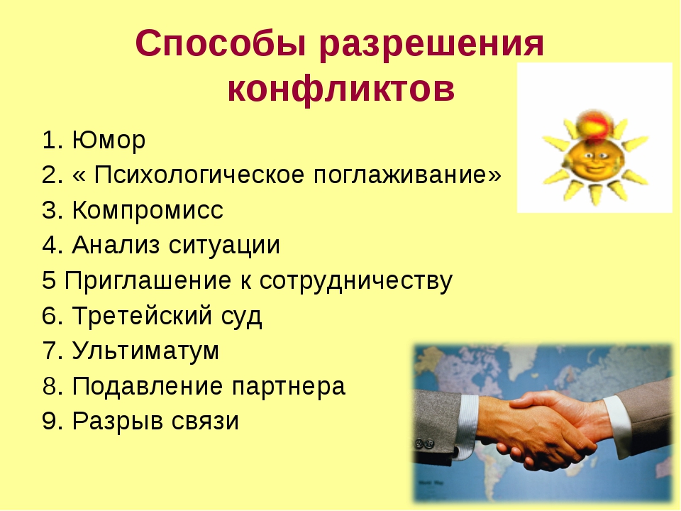 Понятно, что третий путь — самый правильный. В этом случае конфликтные ситуации могут более не повторяться. В первом случае такое практически невозможно — участники конфликта будут стоять не на жизнь, а на смерть. И даже второй способ не панацея — компромисс может сработать один или несколько раз, но в дальнейшем перестает удовлетворять обе стороны.