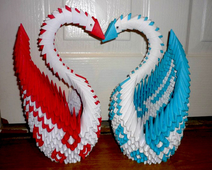 Огромной популярностью у детей и взрослых пользуются схемы лебедей. Чтобы сделать эту птицу своими руками, необходимо сделать много модулей и запастись терпением. Собирается игрушка быстро и просто, но если в доме есть маленькие детки, для надежности модули лучше всего склеить с помощью клея. Фигурку лебедя можно делать из белой бумаги или же разноцветных модулей. Создания лебедя довольно простое.