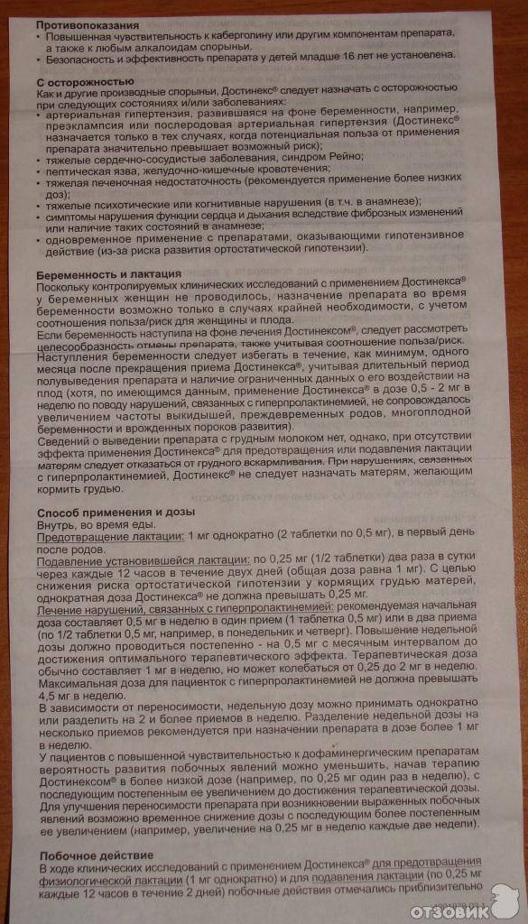 Перед назначением любых препаратов рекомендуется исключить наличие беременности. У кормящих мам часто отсутствует менструальный цикл, но это не значит, что спонтанная овуляция невозможна и беременность не наступит. Иногда женщина знает о новой беременности и именно с целью ее сохранения принимает решение (иногда спорное) подавить лактацию. В этом случае применение Достинекса запрещено. Более того зачатие противопоказано в течение 1 месяца после приема таблетки. Важно помнить, что грудное вскармливание необходимо прекратить сразу после применения первой дозы лекарства.