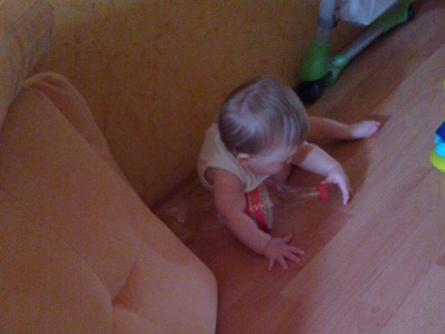 Ребенок передвигается по-пластунски быстро, одолевая значительные расстояния. Хорошо сидит, придерживаясь за опору встает и самостоятельно садиться. Делает первые шаги, придерживаясь за перильца кроватки, диван или другие предметы.
