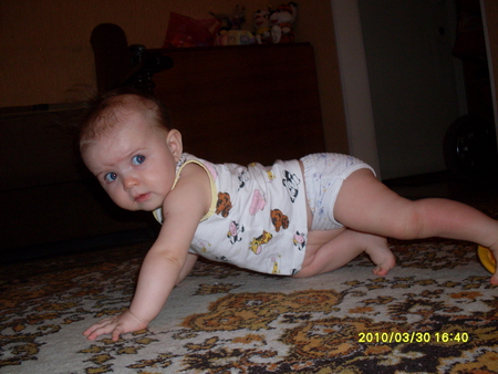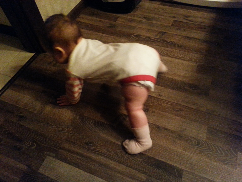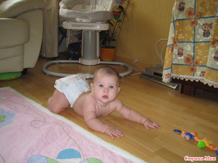 В этот период не только вертится сам, ребенок ползает на животе уверенно и довольно активно. Приподнимается на четвереньки, начинает раскачиваться в этом положении, готовясь ходить.