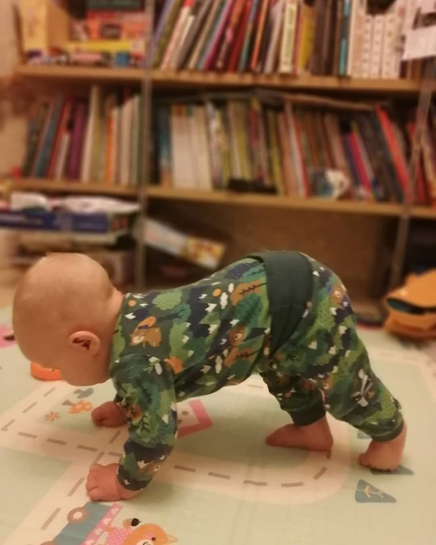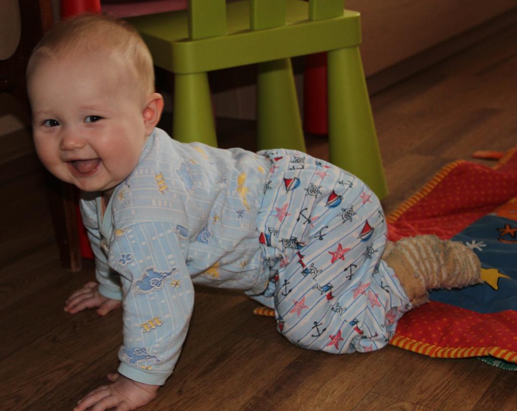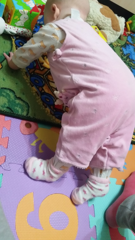 Уже нормально ползает, с опорой на ручки, сидит с выпрямленной спинкой, делает попытки вставать, подтягиваясь за опору в кроватке. Если его придерживать в положении стоя, то переступает ножками, стоит, налегая на стопу.