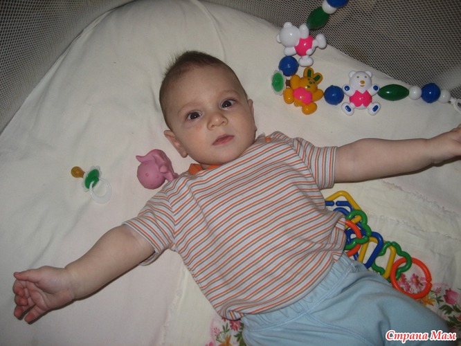 - В 4 месяца его можно учить захватывать различные предметы и свои ножки. А когда он будет тянуть конечности в рот, то мышцы будут растягиваться.