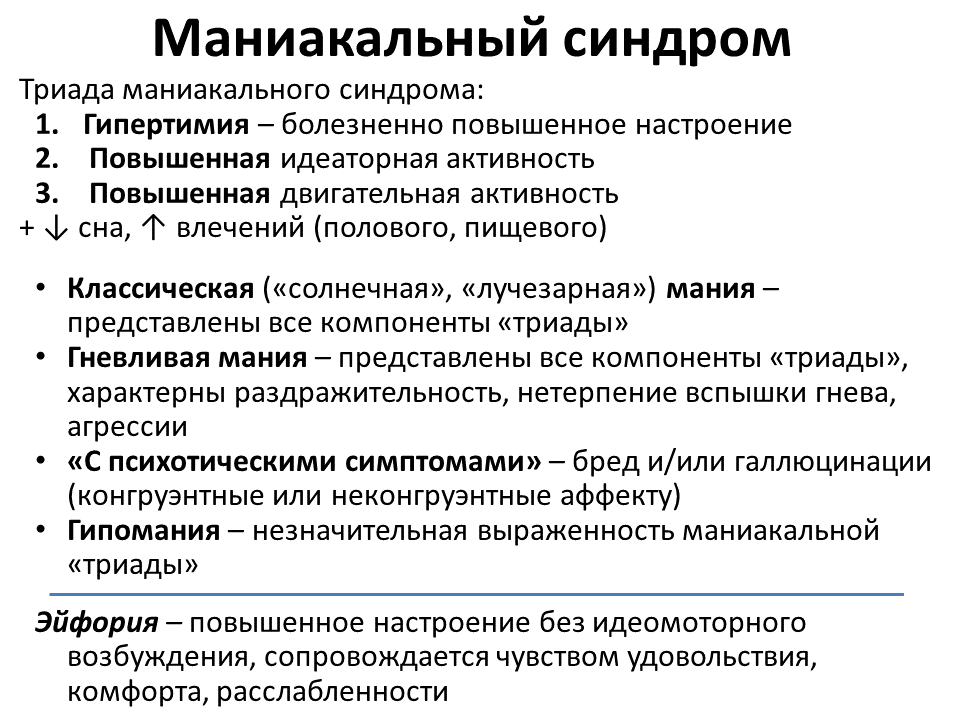 - Нарушение суждений, импульсивность, скачки мыслей и напористая речь