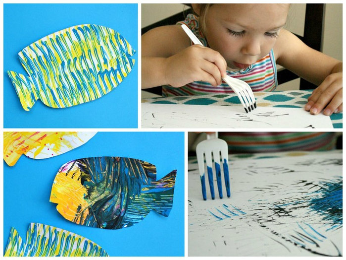 Попросите ребенка окрасить кисточкой ладонь. После этого необходимо оставить рукой оттиск на бумаге и придать полученному изображению узнаваемые формы. Отпечаток может превратиться в рыбку, бабочку, букет, птицу, фигуру животного или какое-нибудь сказочное существо. Для выполнения подобного задания детям приходится использовать разнообразные движения рук: прихлопывание, размазывание, примакивание и другие.