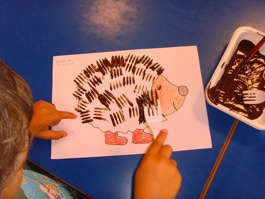 Твердая полусухая кисть. ТРАСТ: Любой. Выразительность: Окраска текстуры, Цвет. Материалы: Жесткая кисть, Гуашь, Бумага любого цвета и формата или вырезать силуэт пушистого или колючего зверька. Продолжение изображения: Ребенок опускает кисть в гуашь и ударяет ею по бумаге, держа вертикально. При работе кисть не падает в воду. Таким образом, заполняется весь лист, контур или шаблон.Получается имитация фактуры пушистой или колючей поверхности.