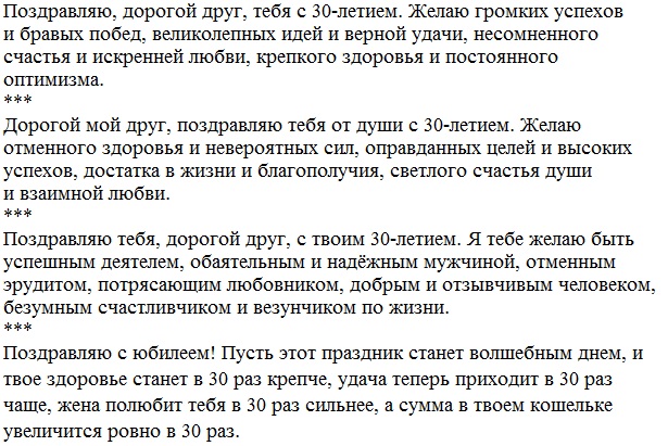 Дружище дорогой, я тебя поздравляю с твоим юбилеем, с чудесным 30-летием. Хочу пожелать блага и удачи в жизни, крепкого здоровья и оптимизма души, великих целей и больших успехов, великолепных возможностей и успешной самореализации.