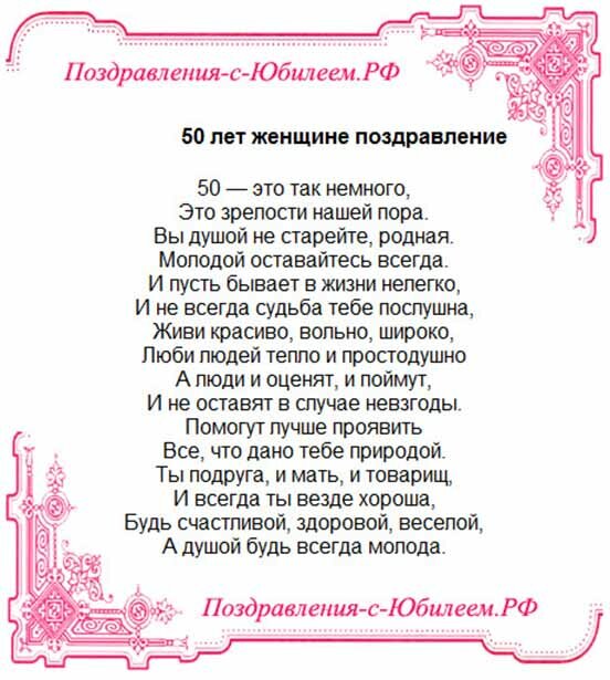 «У французов есть замечательные слова:« Если бы я знал свою молодость, если бы старость могла ». Посередине дороги есть отрезок, тогда сила и опыт могут идти бок о бок. Этот прекрасный возраст сочетает в себе два хороших слова : «Еще» и «уже» Так знайте: жить в такое время приятно и легко.Вам все доступно и уже все понятно. Когда жизнь предлагает череду сложных испытаний, решайте за них смело, ничего не бойтесь! Тебе уже 50! Если молодость манит, с ней по очереди стань, ведь тебе всего 50!