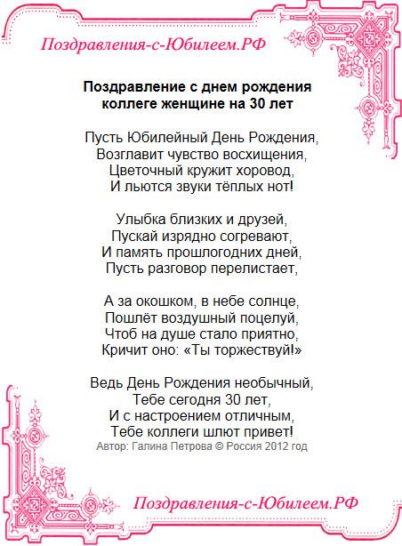 Тебя с юбилеем мы поздравляем, Любви и удачи мы пожелаем. Счастья, богатства и оптимизма, Во всех делах твоих героизма. Молодость только рассвет обретает, Пусть никогда она не угасает. 30 — лет стажа быть самым лучшим, Желаем тебе быть все лучше и лучше.