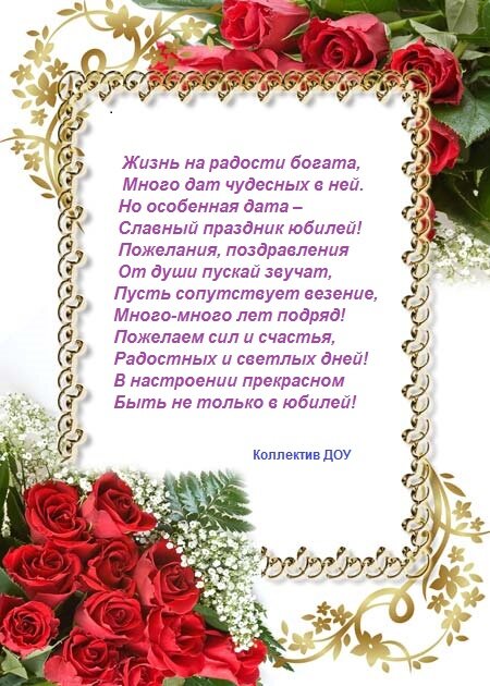 Мы рады поздравить Вас с прекрасным праздником – пятидесятилетним юбилеем! Мы желаем, чтобы Вы не останавливались на достигнутом, так же упорно шли вперед! Вас окружают любящие родные и близкие, коллеги ценят Ваш опыт и авторитет! Крепкого здоровья, успеха и множества поводов для радости!