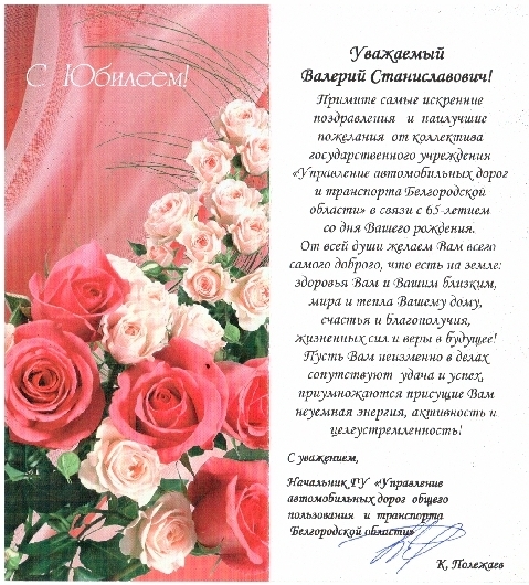 Пройден значительный отрезок жизни, в которой было все – и радость удачи и обида разочарований. Но, не смотря ни на что, Вы сумели дойти до большой красивой даты. И в Ваши золотые пятьдесят мы желаем Вам, чтобы в Вашей жизни было как можно больше светлых дней, чтобы рядом с Вами всегда находились любящие и достойные люди. Мы уверены в том, что Ваши обаяние, профессионализм и настойчивость в достижении поставленных целей и дальше будут приносить Вам заслуженные победы. Здоровья, счастья и всех благ Вам, дорой наш юбиляр!