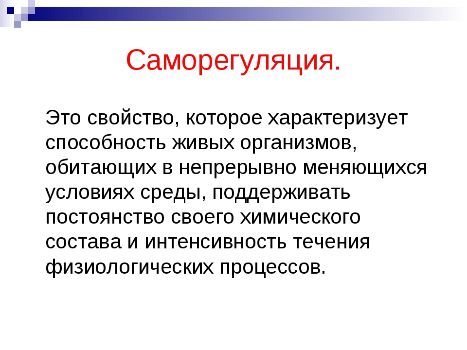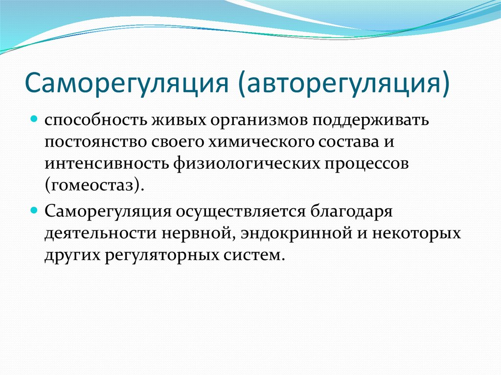 Саморегуляция— свойство биологических систем устанавливать и поддерживать на определенном, относительно постоянном уровне те или иные физиологические или другие биологические показатели.