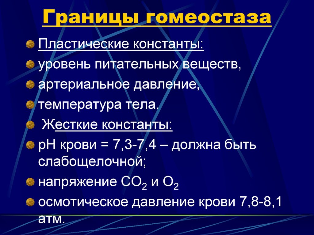 Эти константы не являются строго постоянными. Возможны и отклонения их от какого-то среднего уровня в ту или другую сторону в своеобразном «коридоре». Для каждого параметра границы максимально возможных отклонений свои. Отличаются они и по времени, в течение которого организм может выдерживать нарушение конкретного параметра гомеостаза без каких-либо серьезных последствий.