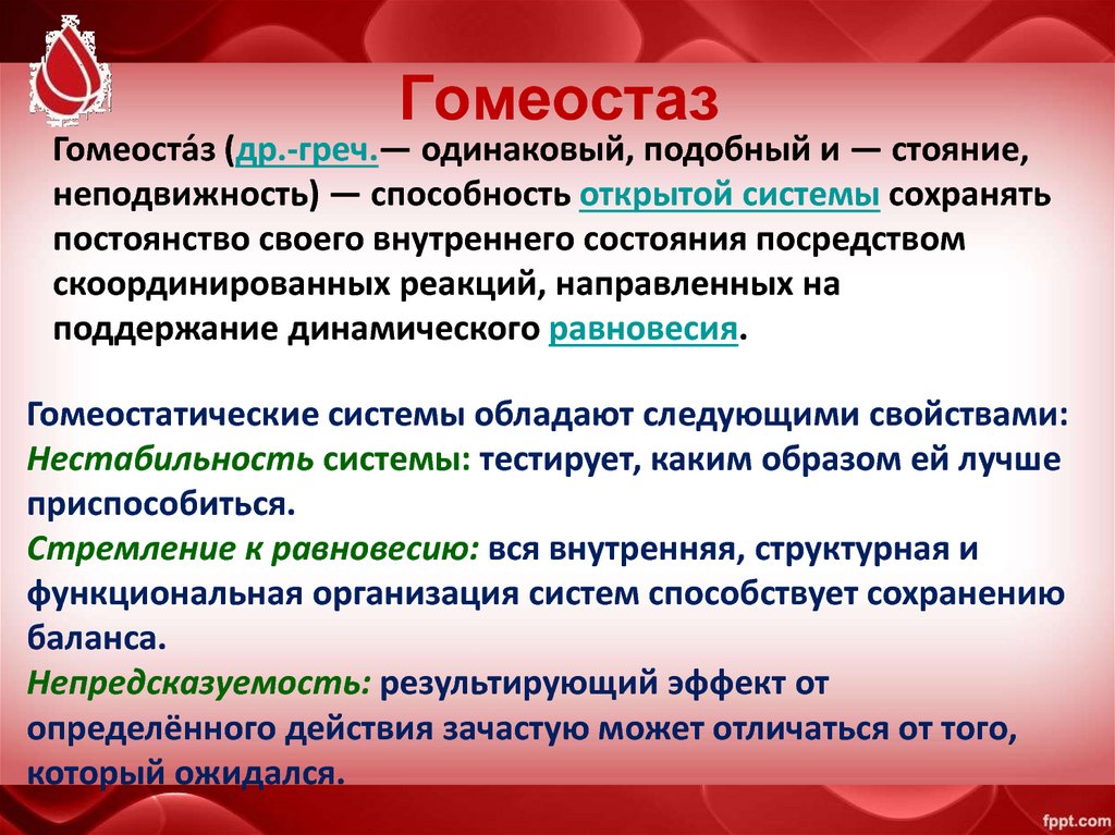 Свойства гомеостазов – 1. Нестабильность системы 2. Стремление к равновесию 3. Непредсказуемость.