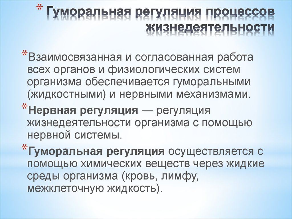 Регуляция различных функций осуществляется двумя путями: гуморальным и нервным.