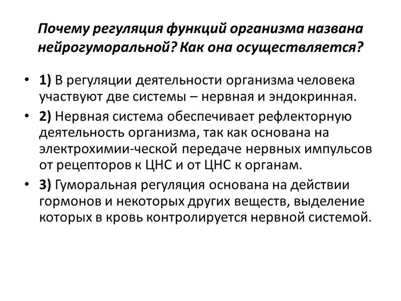 ● Процессы нервной регуляции обеспечивают точный и быстрый ответ организма на действие раздражителей (двигательную активность, поведенческие реакции). Процессы жизнедеятельности, длительно протекающие в организме (рост, развитие, обмен веществ и др.) регулируются преимущественно гуморальным путём.