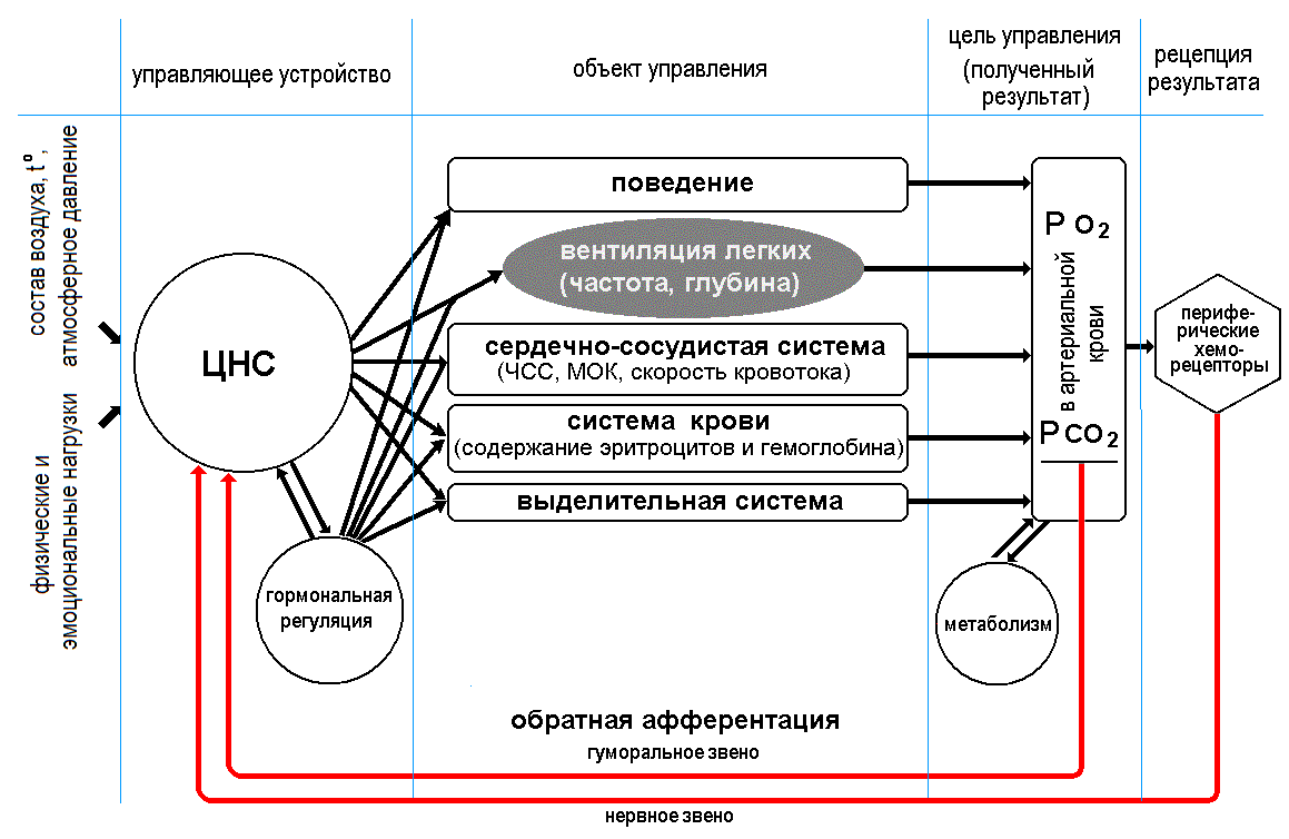 Повышение концентрации углекислого газа в крови вызывает стимуляцию дыхательного центра продолговатого мозга. Вследствие этого увеличиваются частота и глубина дыхания и уровень углекислого газа в крови возвращается к норме.
