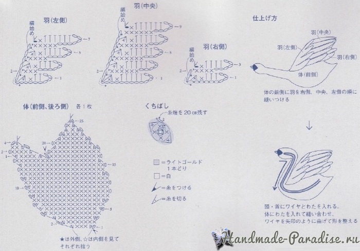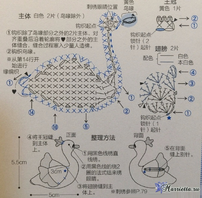 Схемы этих лебедей очень похожи, но вторая немного проще. Поскольку данная игрушка так же объемная, то и плести ее нужно по тому же принципу, выгибая ряды от себя и к себе.