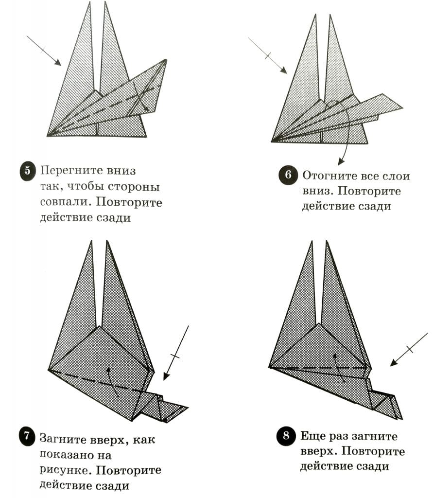 - Повернем журавлика противоположной стороной и проделаем те же действия, что и в пункте 6;