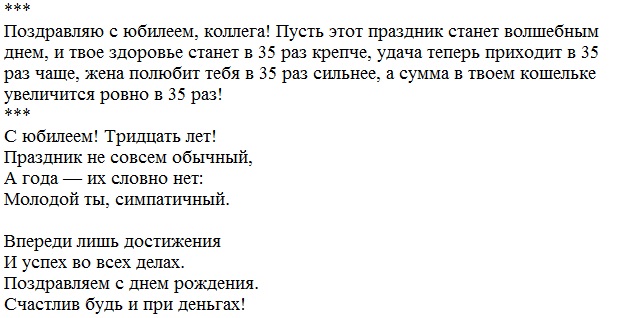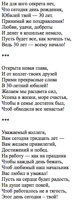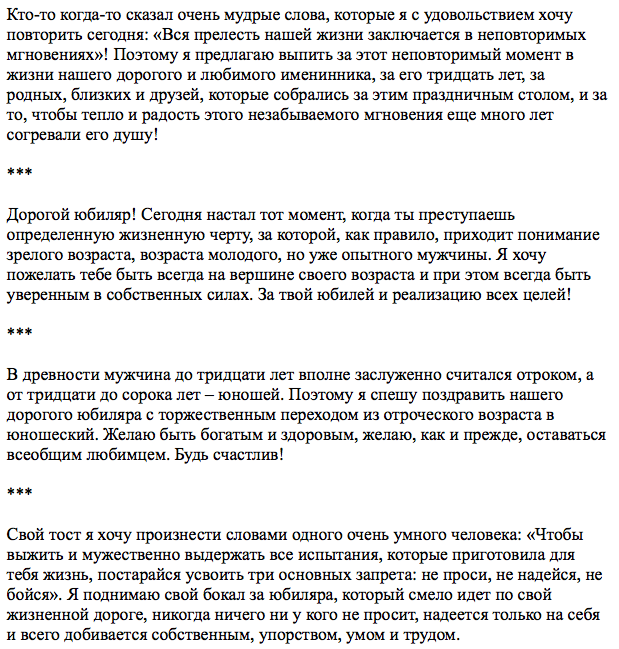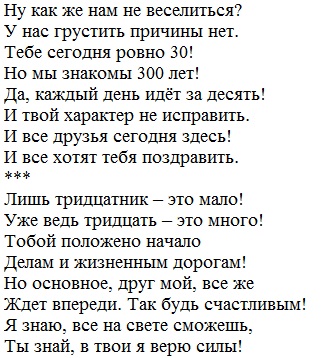 30 лет на этом свете, Прожил ты не просто так. Есть семья — жена и дети, Шик материальных благ. В общем, жизнь твоя — малина! Остаётся пожелать, Чтобы не было причины В этой жизни унывать, Чтоб ты рос и развивался, Чтоб любовь в семье была, Чтобы чаще улыбался, И варила голова, Чтоб здоровье крепким было, Чтоб людьми ты был ценим, Пламя в сердце не остыло Много лет и много зим!