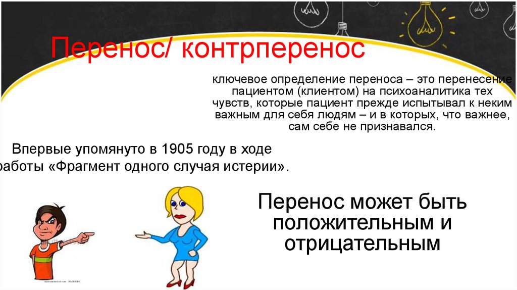 Таким образом, ключевое определение переноса – это перенесение пациентом (клиентом) на психоаналитика тех чувств, которые пациент прежде испытывал к неким важным для себя людям – и в которых, что важнее, сам себе не признавался. Согласно словарю по психоанализу Валерия Лейбина (2010 г), перенос характеризуется