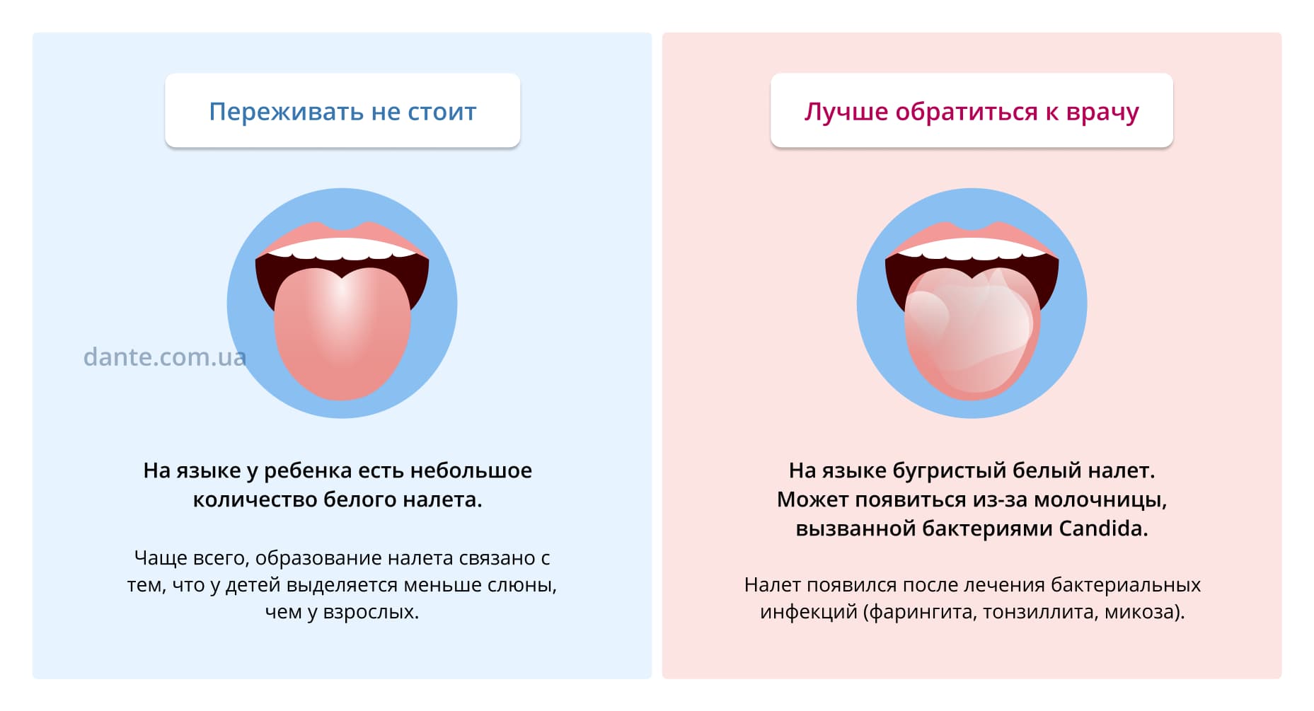 Поводом для беспокойства является, если белый налет плотного слоя или имеет творожистую структуру, не очищается. Это может быть признаком грибкового поражения. Среди других причин: однообразное питание, недостаток витаминов, плохая гигиена, курение, интоксикация, ношение зубных протезов, прием медицинских препаратов.