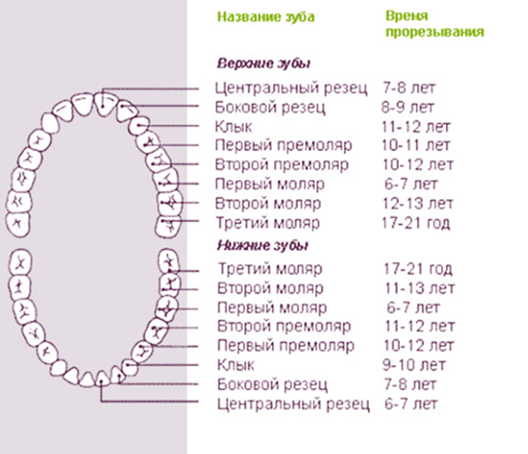- сроки для молочных и постоянных зубов (схема),
