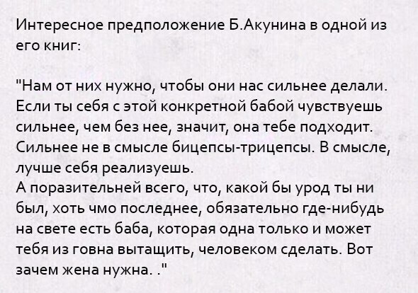 Задумывался ли ты над тем, зачем настоящему мужику жена нужна? Чтобы он без нее от счастья с ума не сошел? А может жены делают мужчин сильнее и лучше? Сложный вопрос.